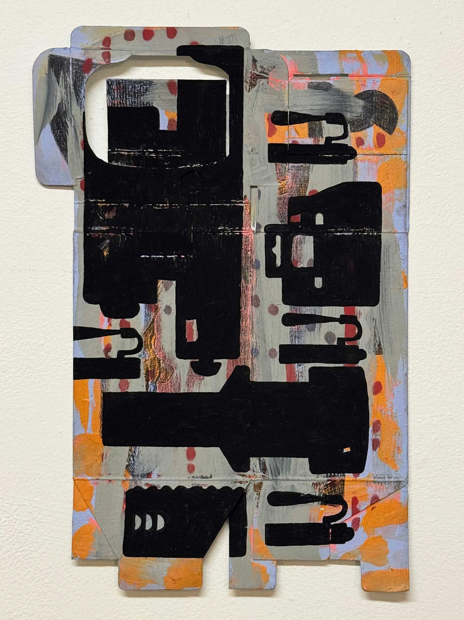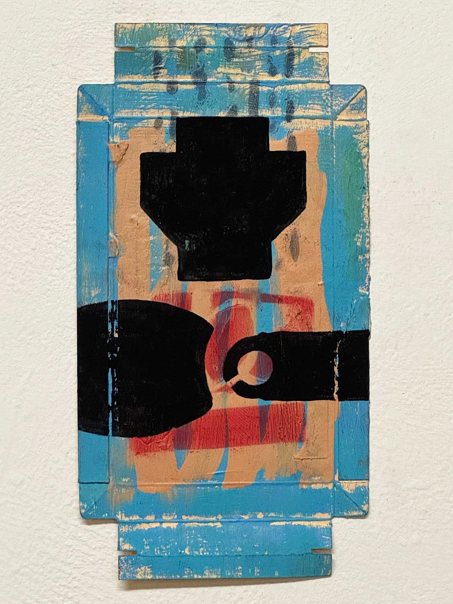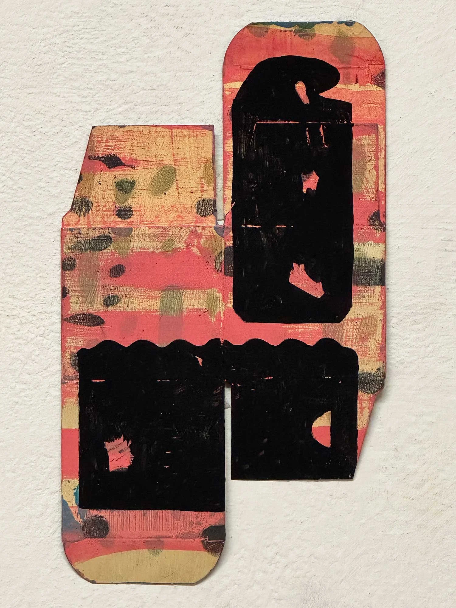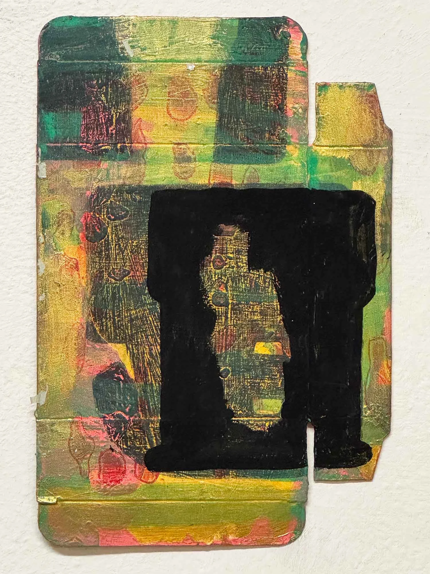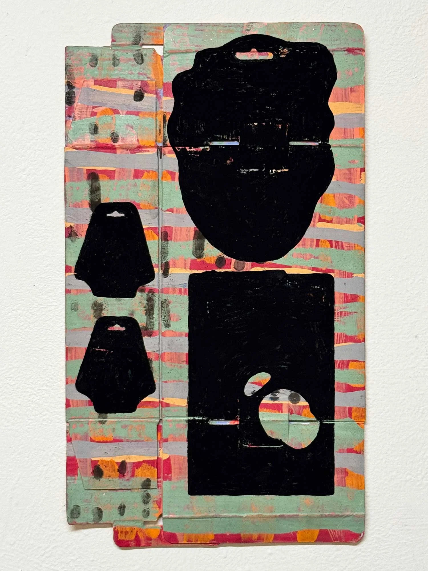 Black Deep: An ongoing series of small work on flattened commercial packaging. Paint (with a bit of red glitter), pastel, occasional ink, and black forms in intense black paint from Jackson’s. The black shapes are outlined with my collection of hundreds of various sized tags, labels, etc. from commercial goods. Sizes from approximately 6” x 4” to 19” x 12”. All 2026.