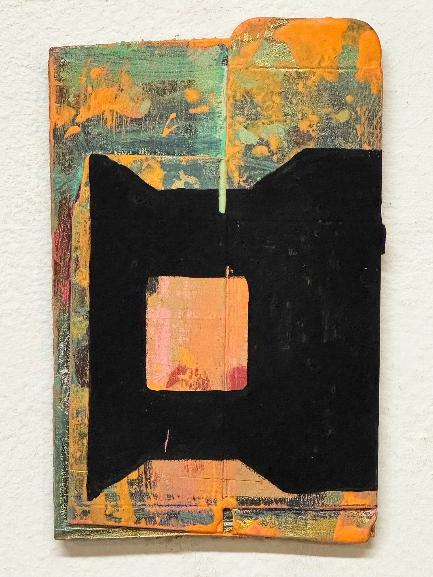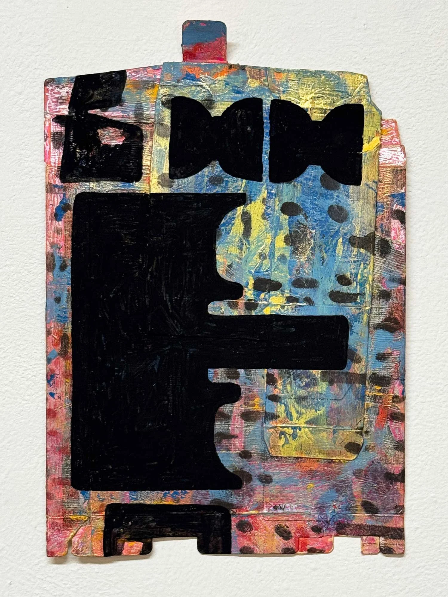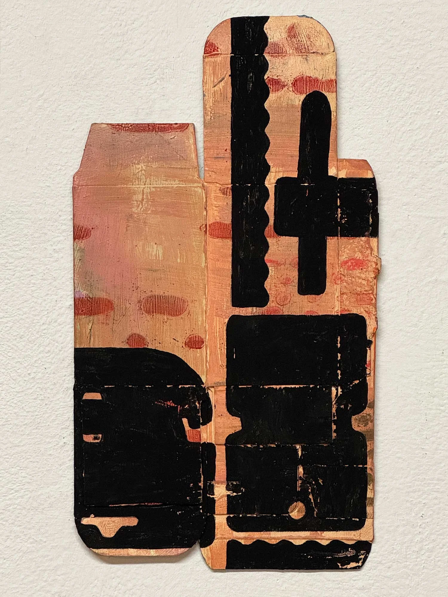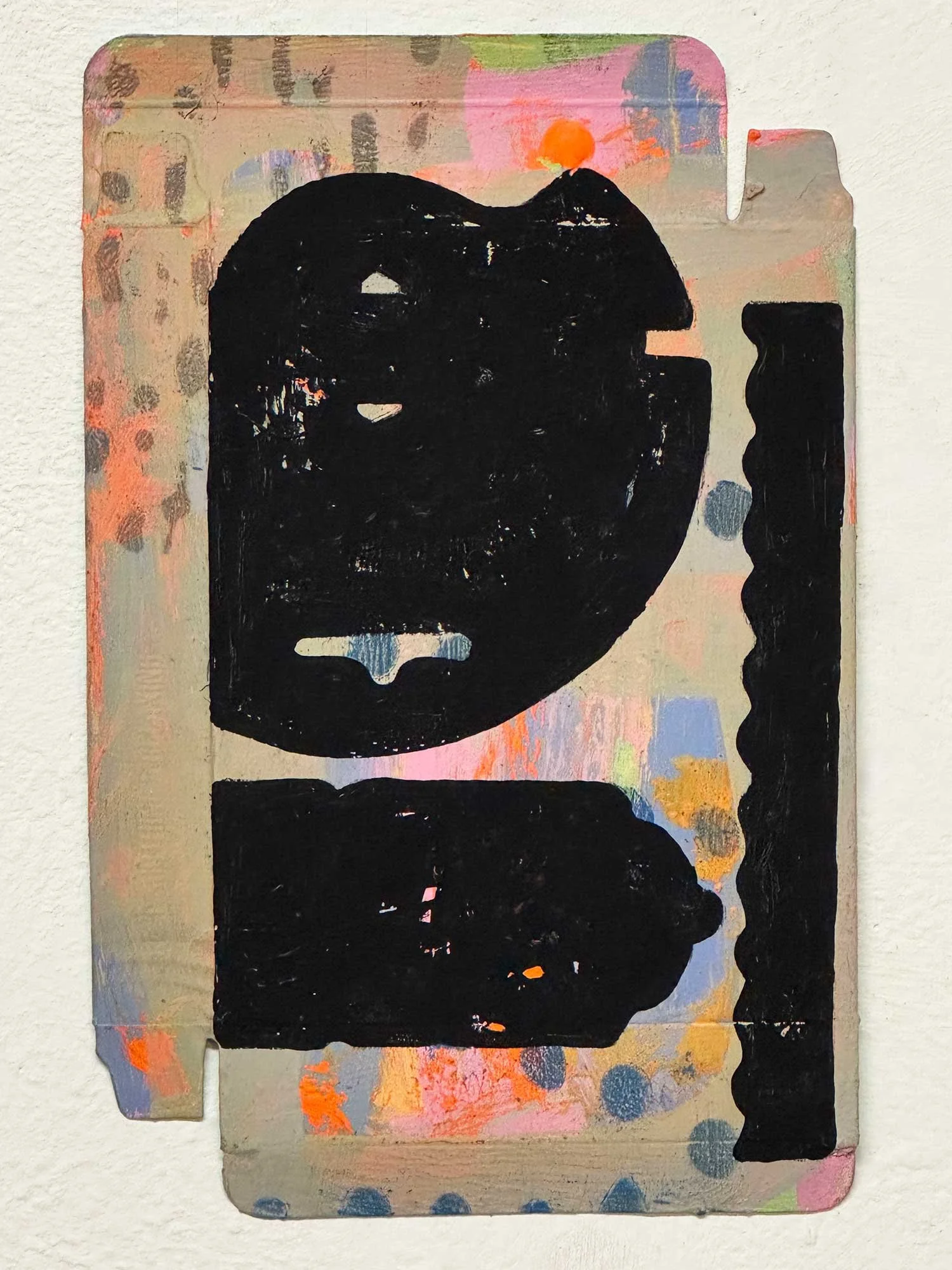 Black Deep: An ongoing series of small work on flattened commercial packaging. Paint (with a bit of red glitter), pastel, occasional ink, and black forms in intense black paint from Jackson’s. The black shapes are outlined with my collection of hundreds of various sized tags, labels, etc. from commercial goods. Sizes from approximately 6” x 4” to 19” x 12”. All 2026.