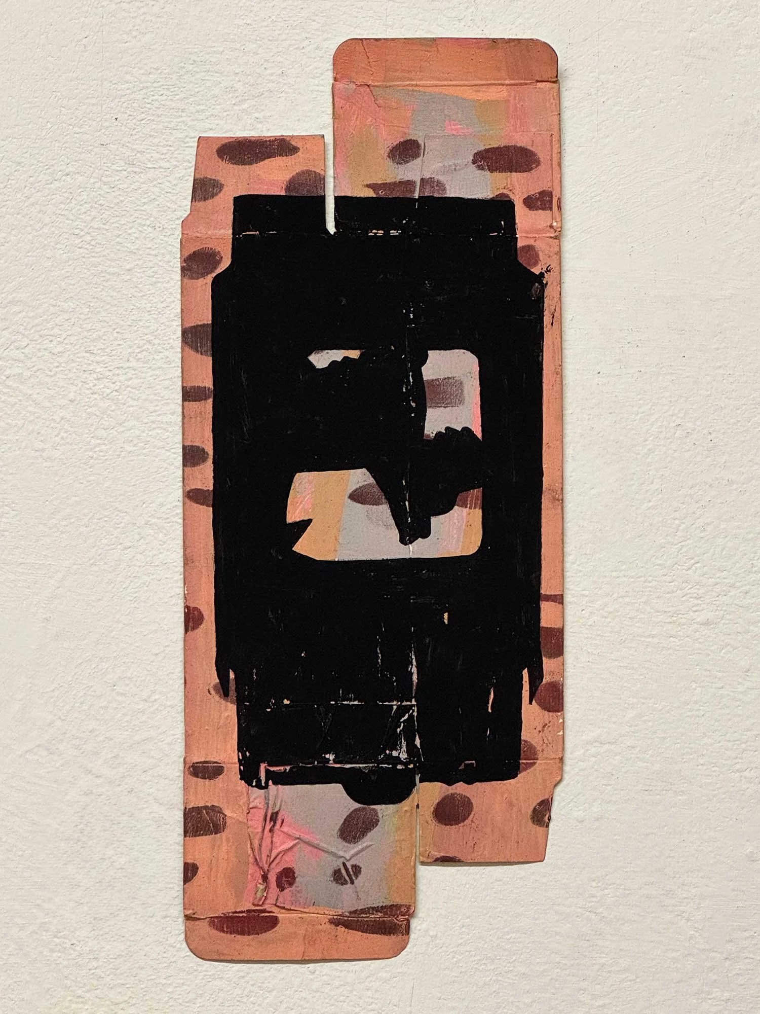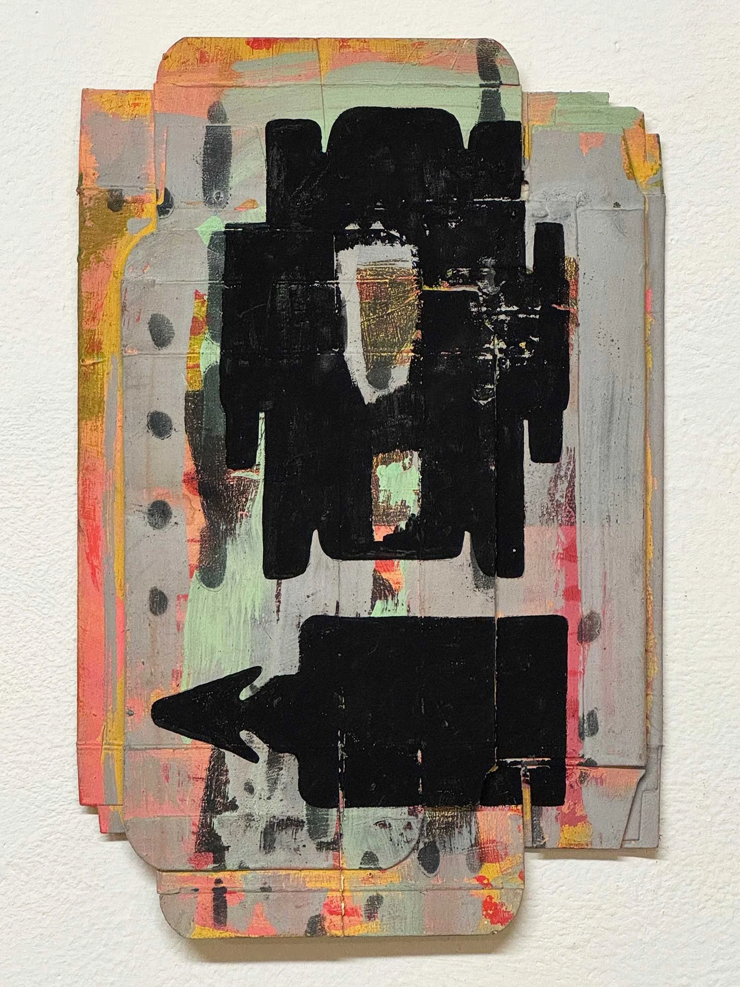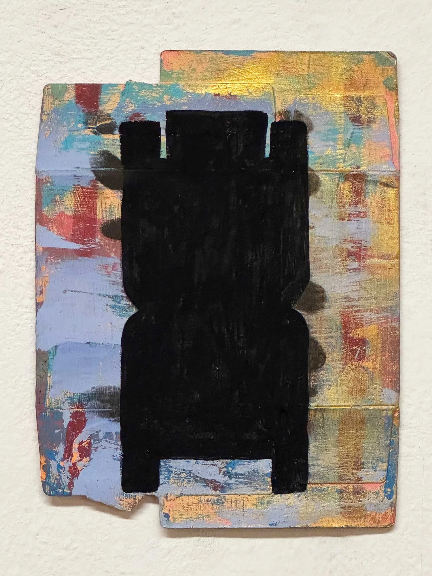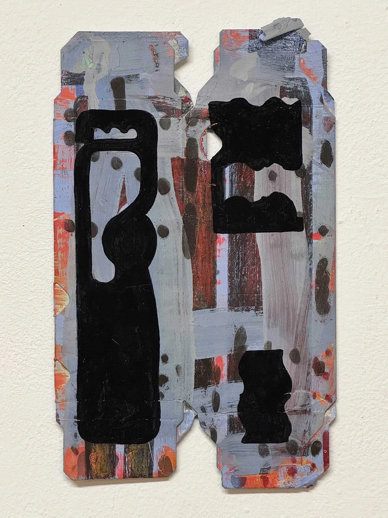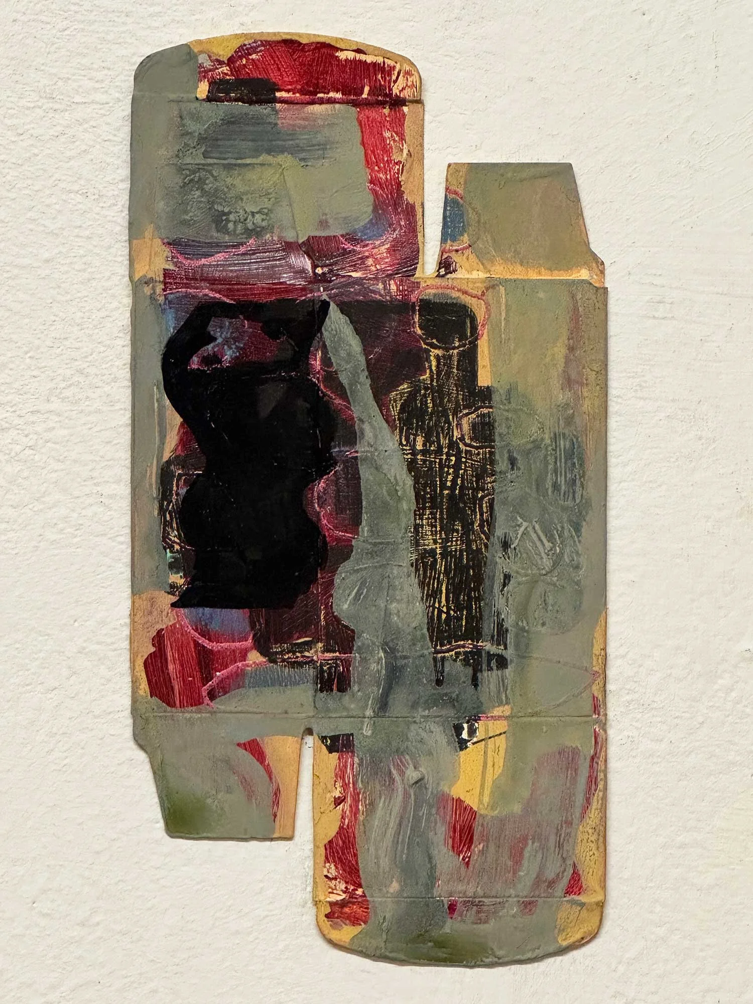 Black Deep: An ongoing series of small work on flattened commercial packaging. Paint (with a bit of red glitter), pastel, occasional ink, and black forms in intense black paint from Jackson’s. The black shapes are outlined with my collection of hundreds of various sized tags, labels, etc. from commercial goods. Sizes from approximately 6” x 4” to 19” x 12”. All 2026.