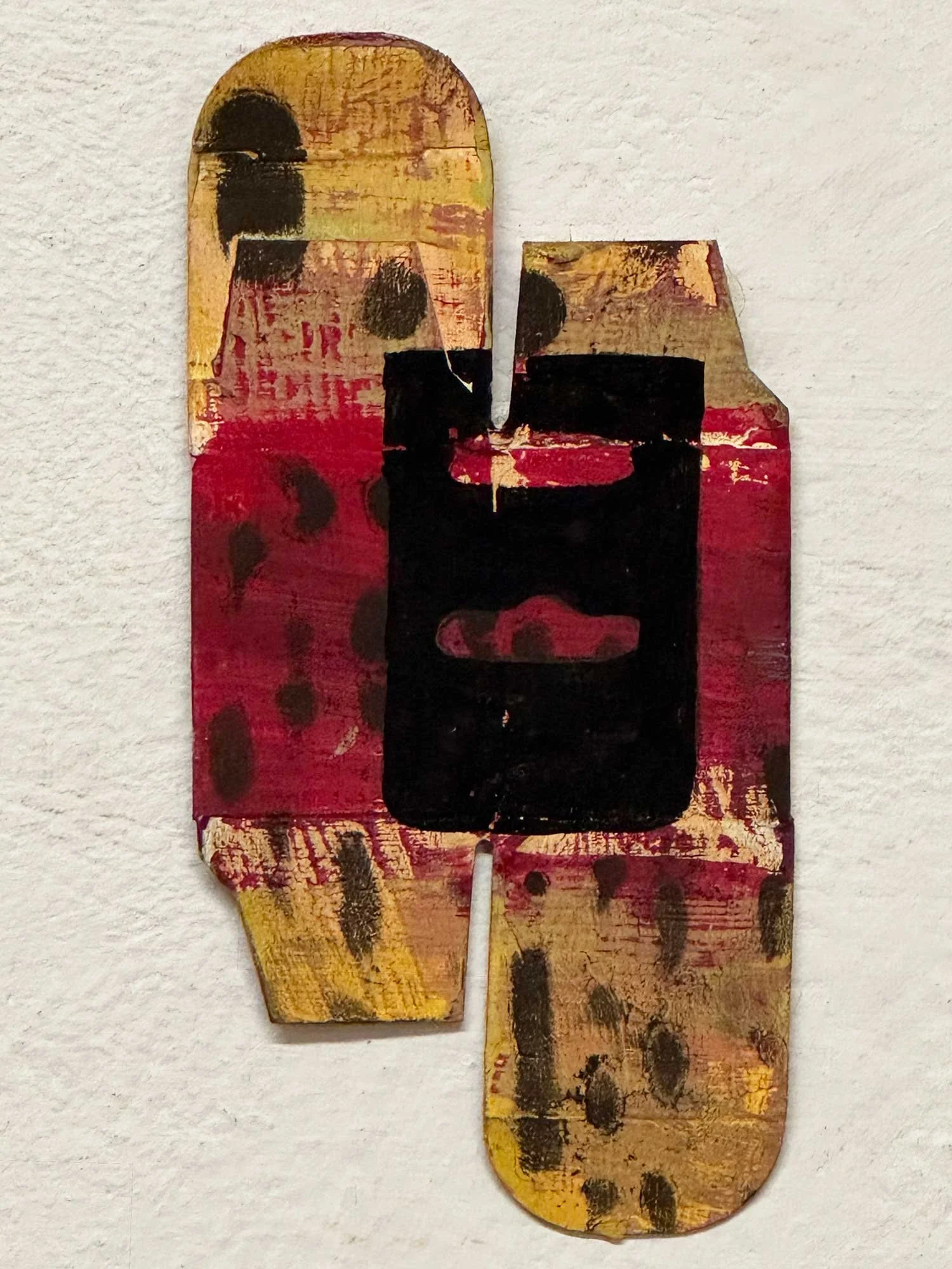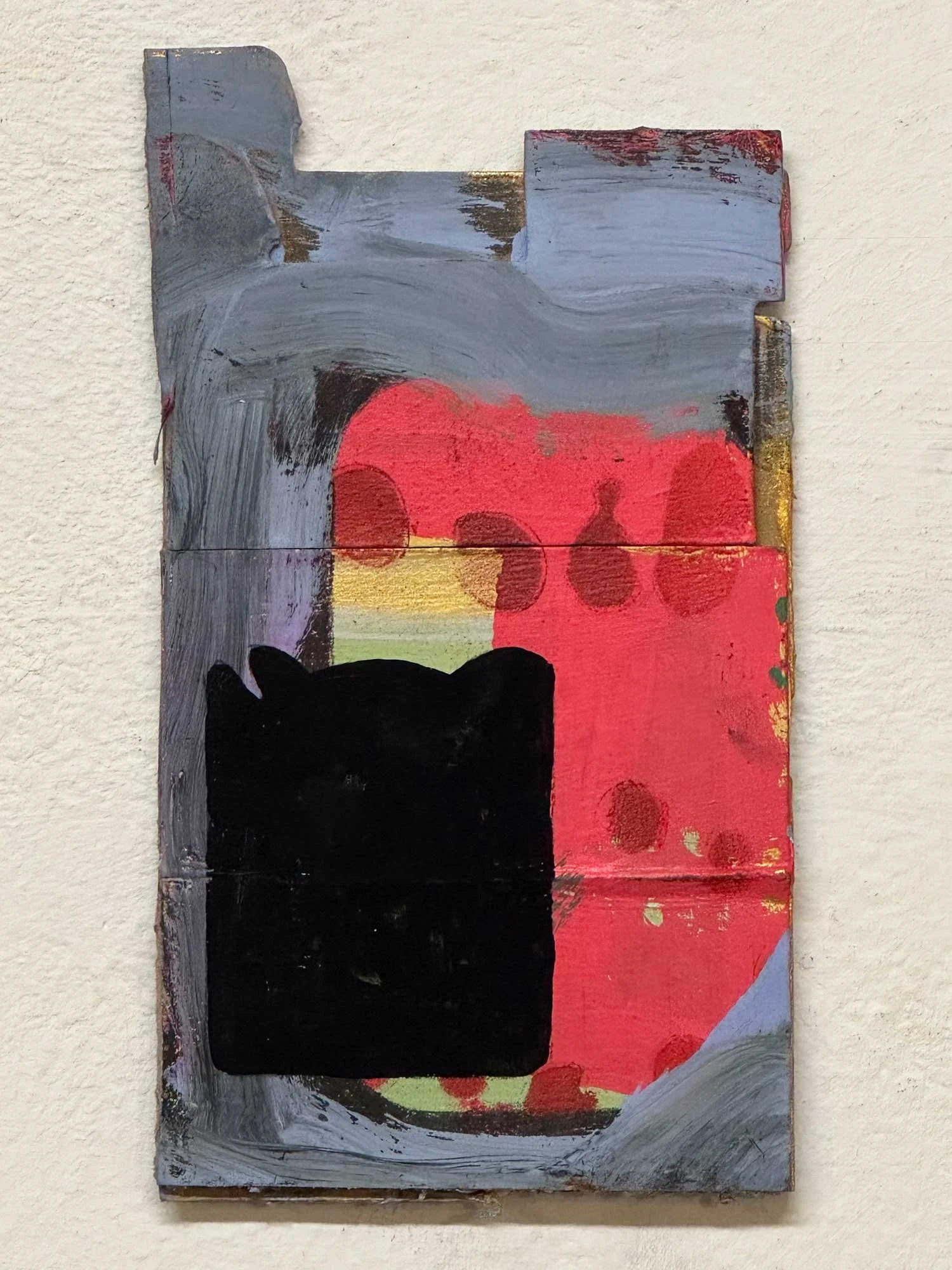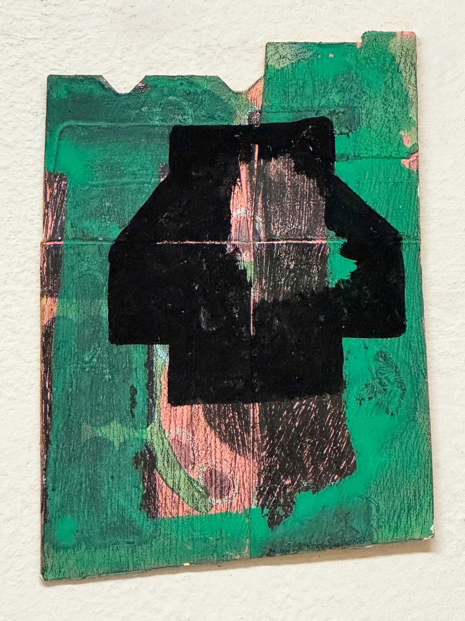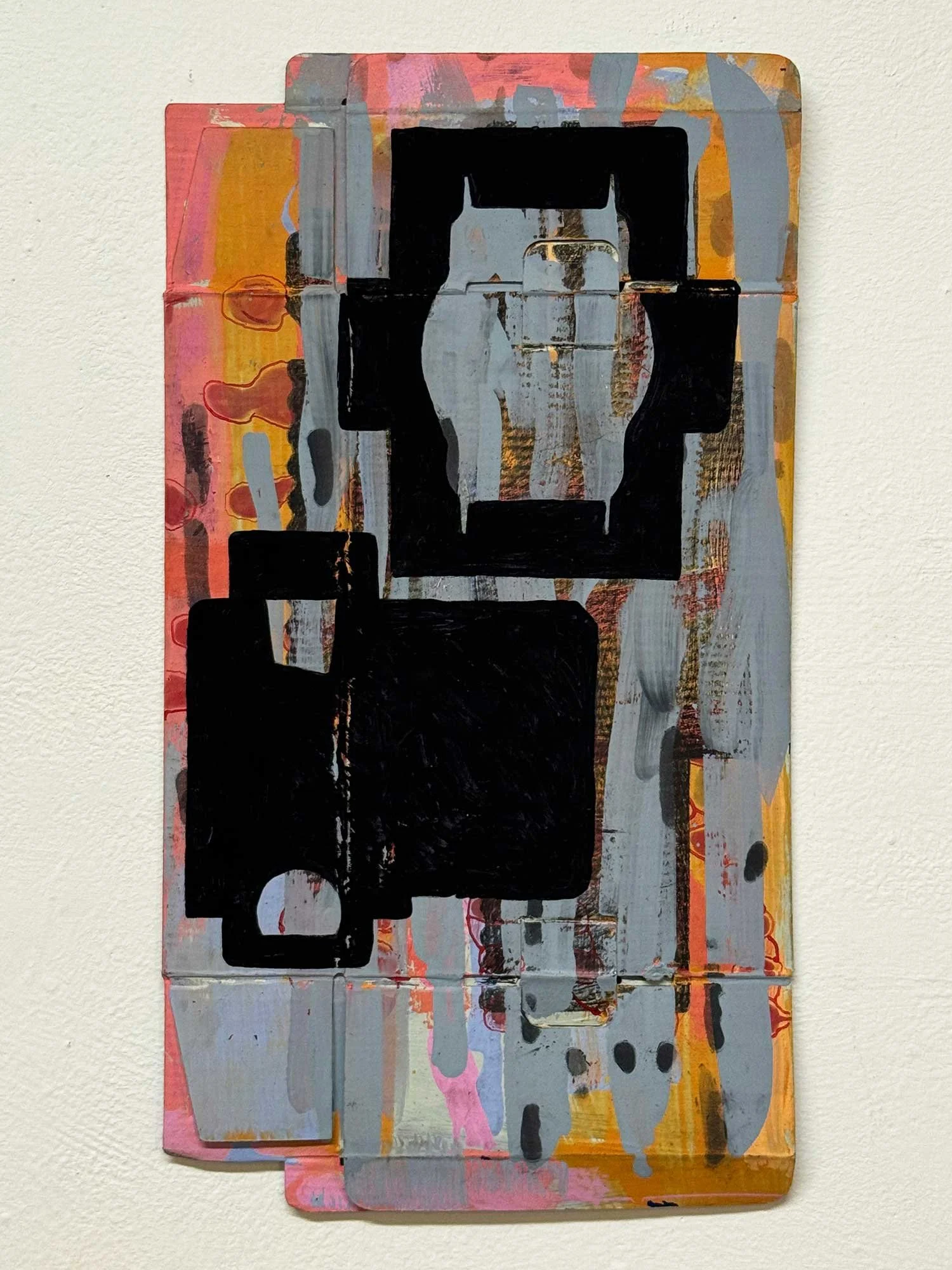 Black Deep: An ongoing series of small work on flattened commercial packaging. Paint (with a bit of red glitter), pastel, occasional ink, and black forms in intense black paint from Jackson’s. The black shapes are outlined with my collection of hundreds of various sized tags, labels, etc. from commercial goods. Sizes from approximately 6” x 4” to 19” x 12”. All 2026.