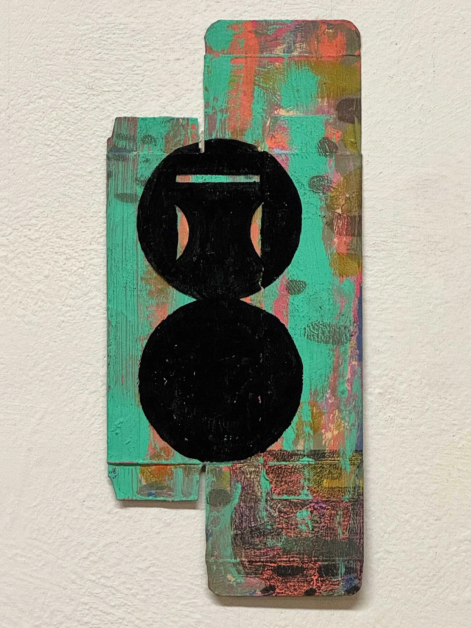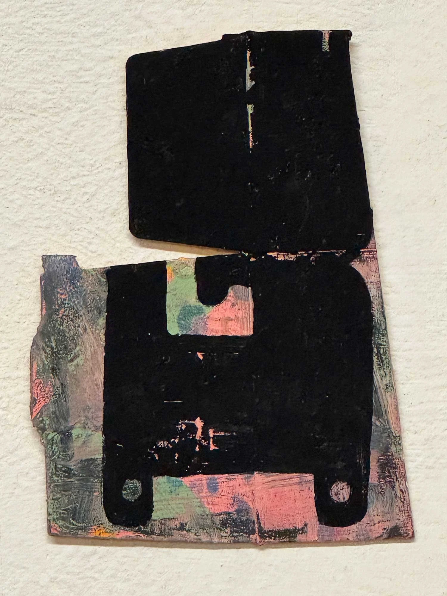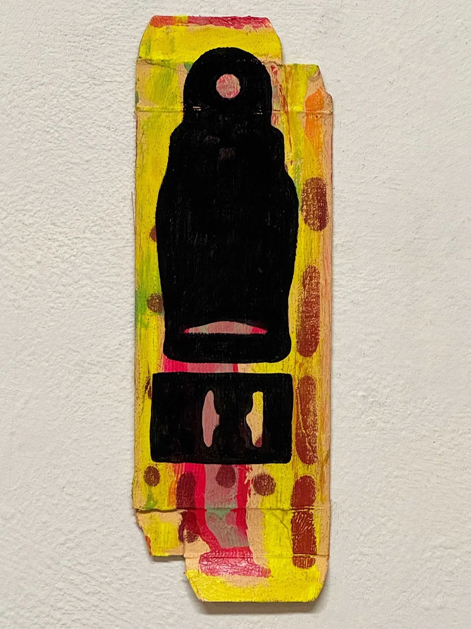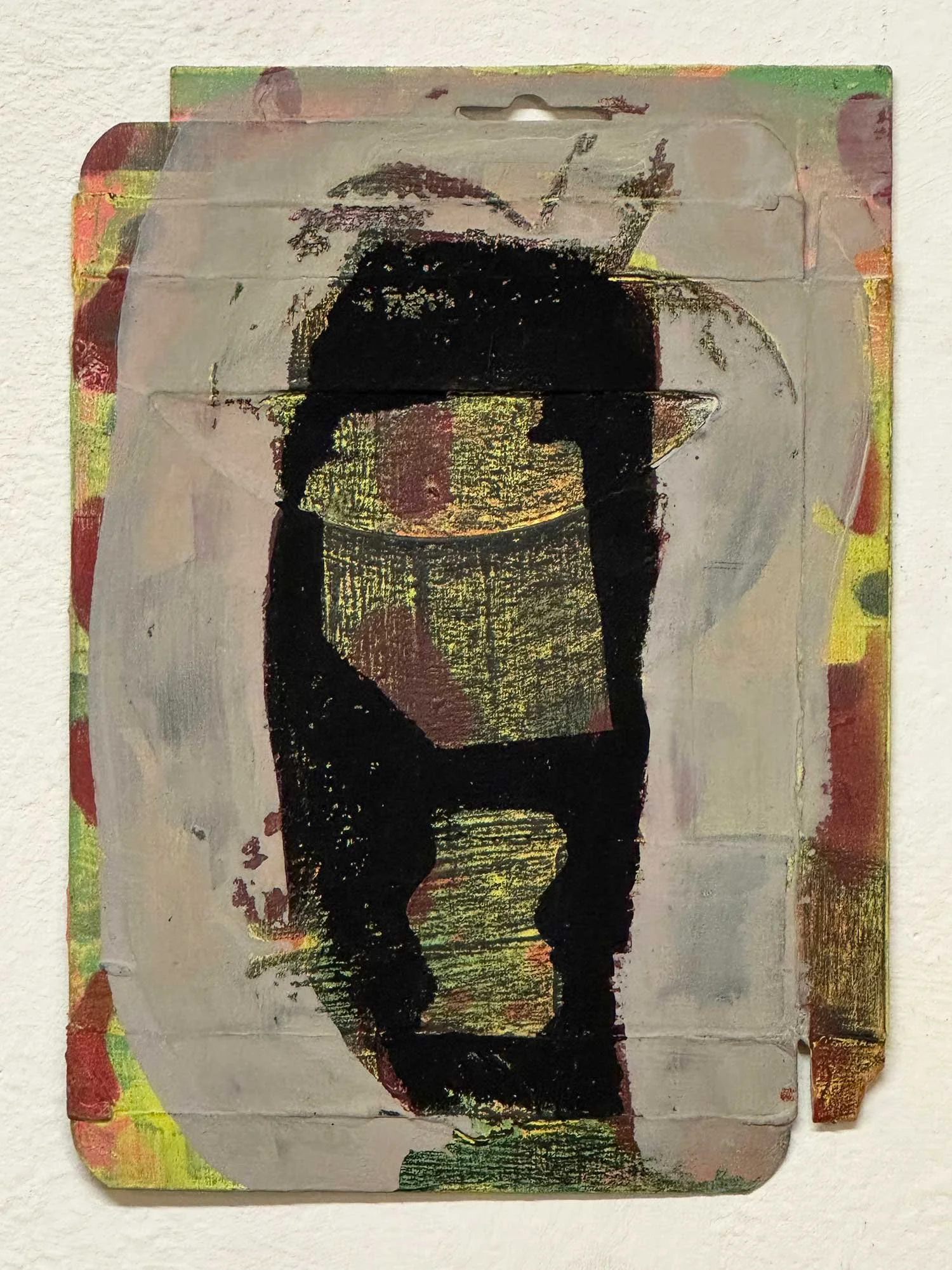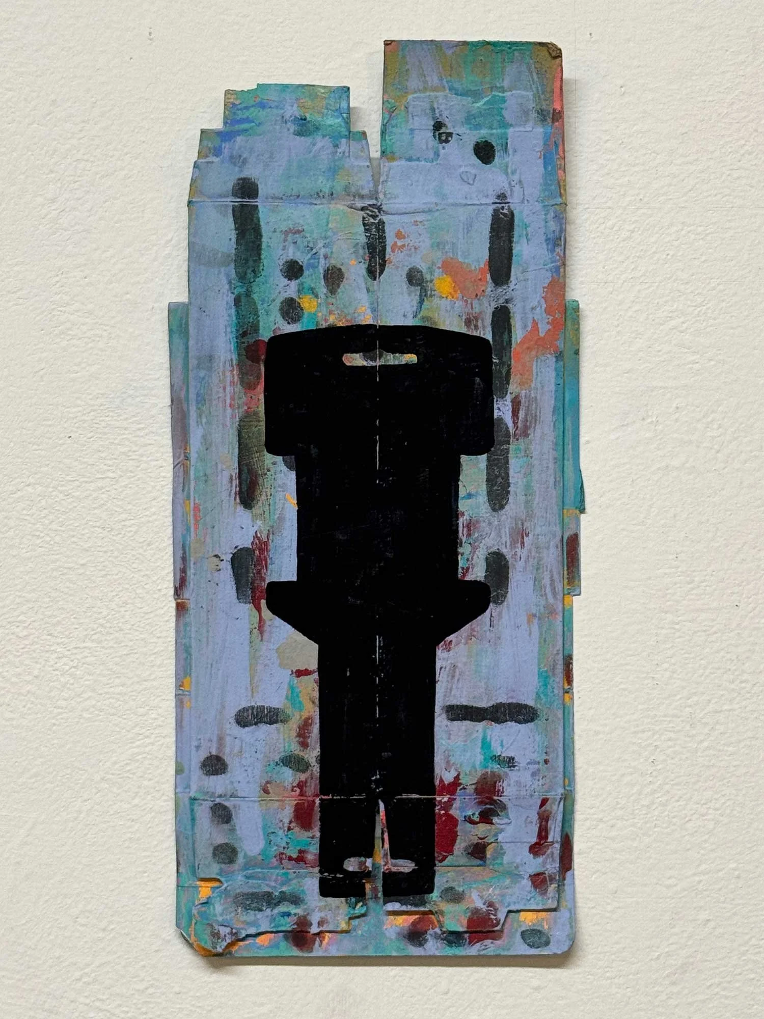 Black Deep: An ongoing series of small work on flattened commercial packaging. Paint (with a bit of red glitter), pastel, occasional ink, and black forms in intense black paint from Jackson’s. The black shapes are outlined with my collection of hundreds of various sized tags, labels, etc. from commercial goods. Sizes from approximately 6” x 4” to 19” x 12”. All 2026.