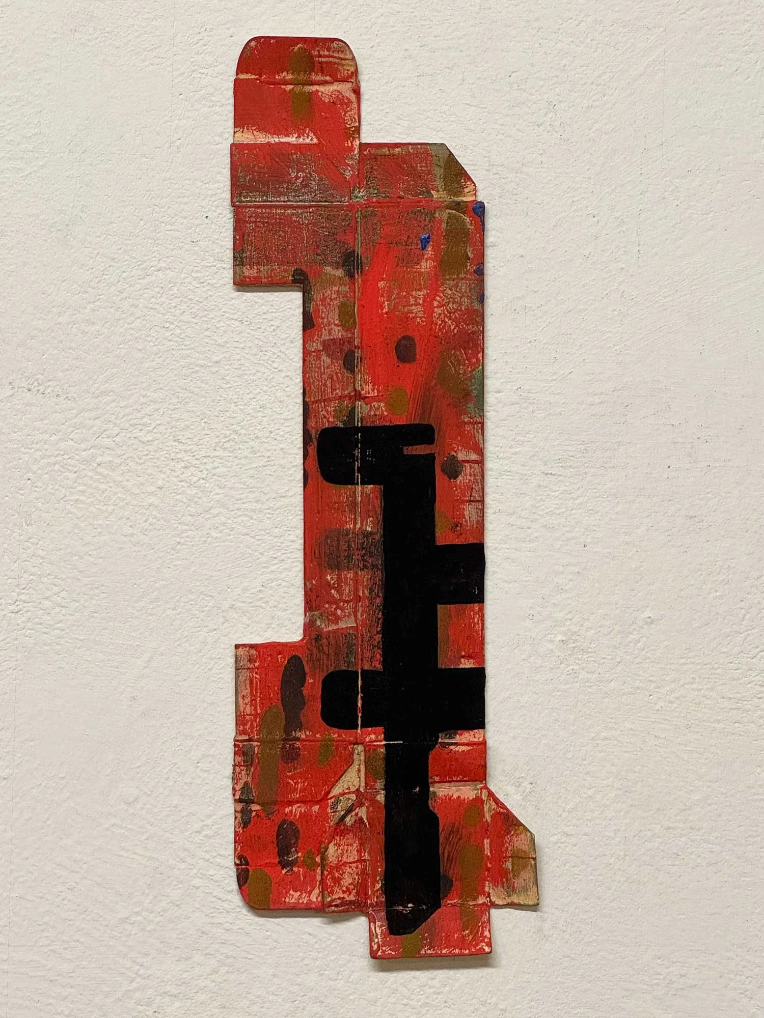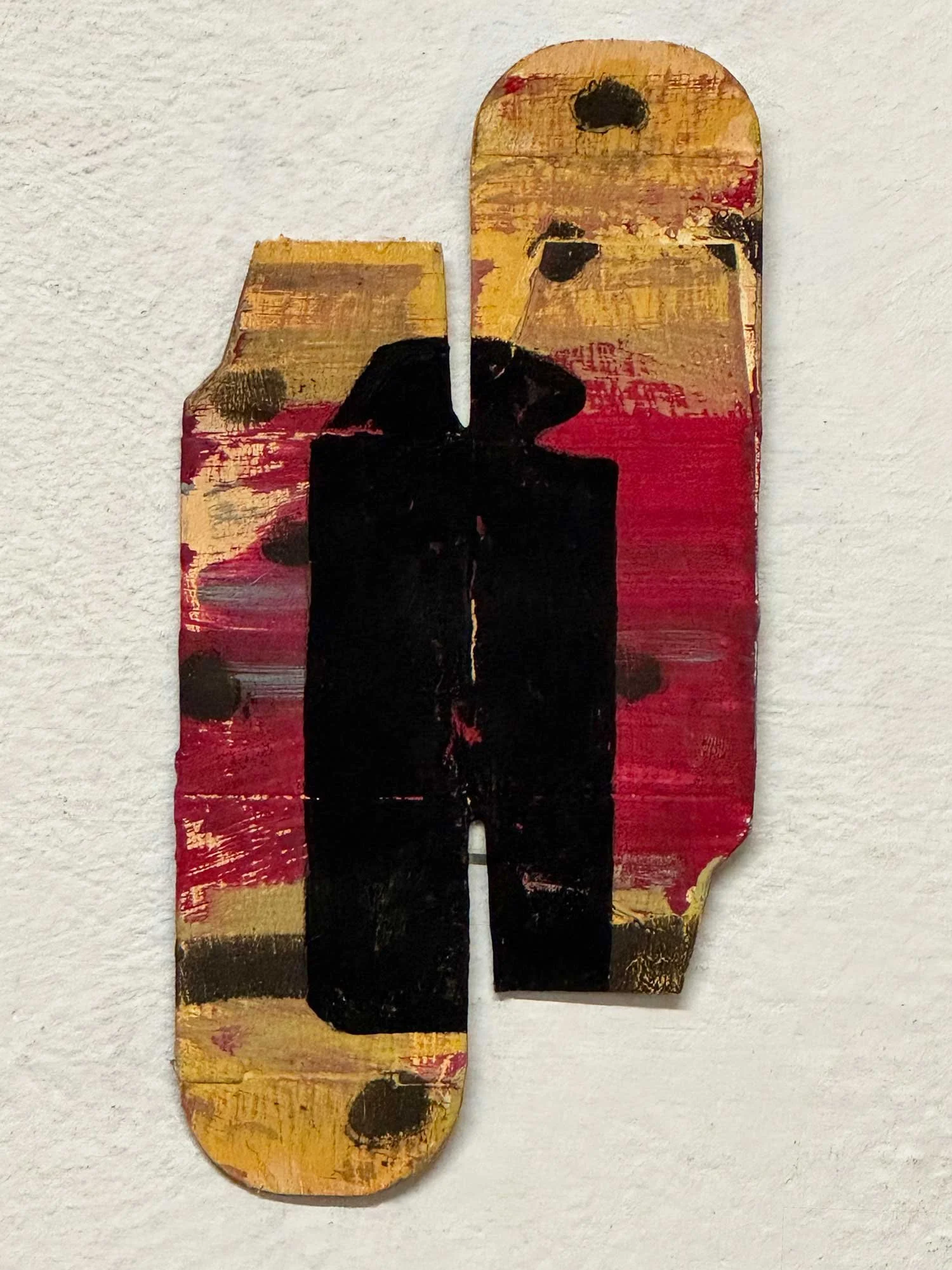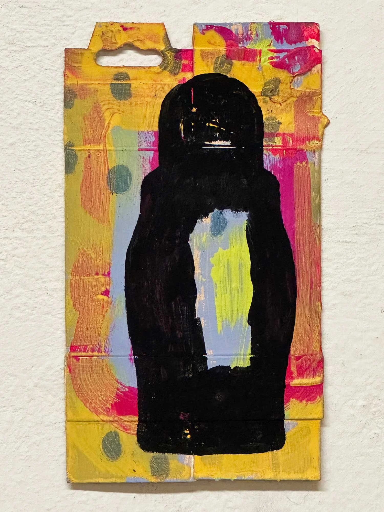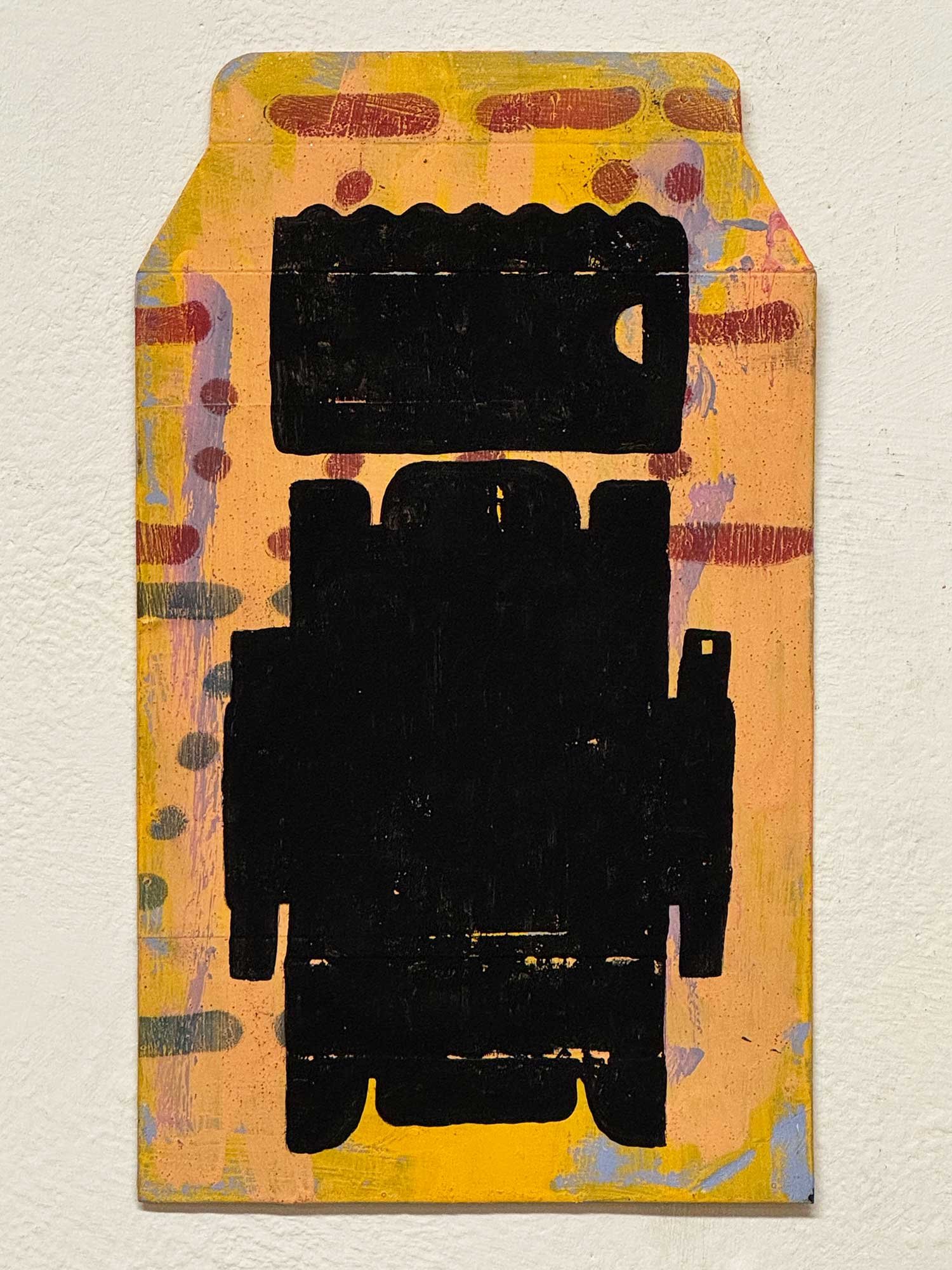Black Deep: An ongoing series of small work on flattened commercial packaging. Paint (with a bit of red glitter), pastel, occasional ink, and black forms in intense black paint from Jackson’s. The black shapes are outlined with my collection of hundreds of various sized tags, labels, etc. from commercial goods. Sizes from approximately 6” x 4” to 19” x 12”. All 2026.