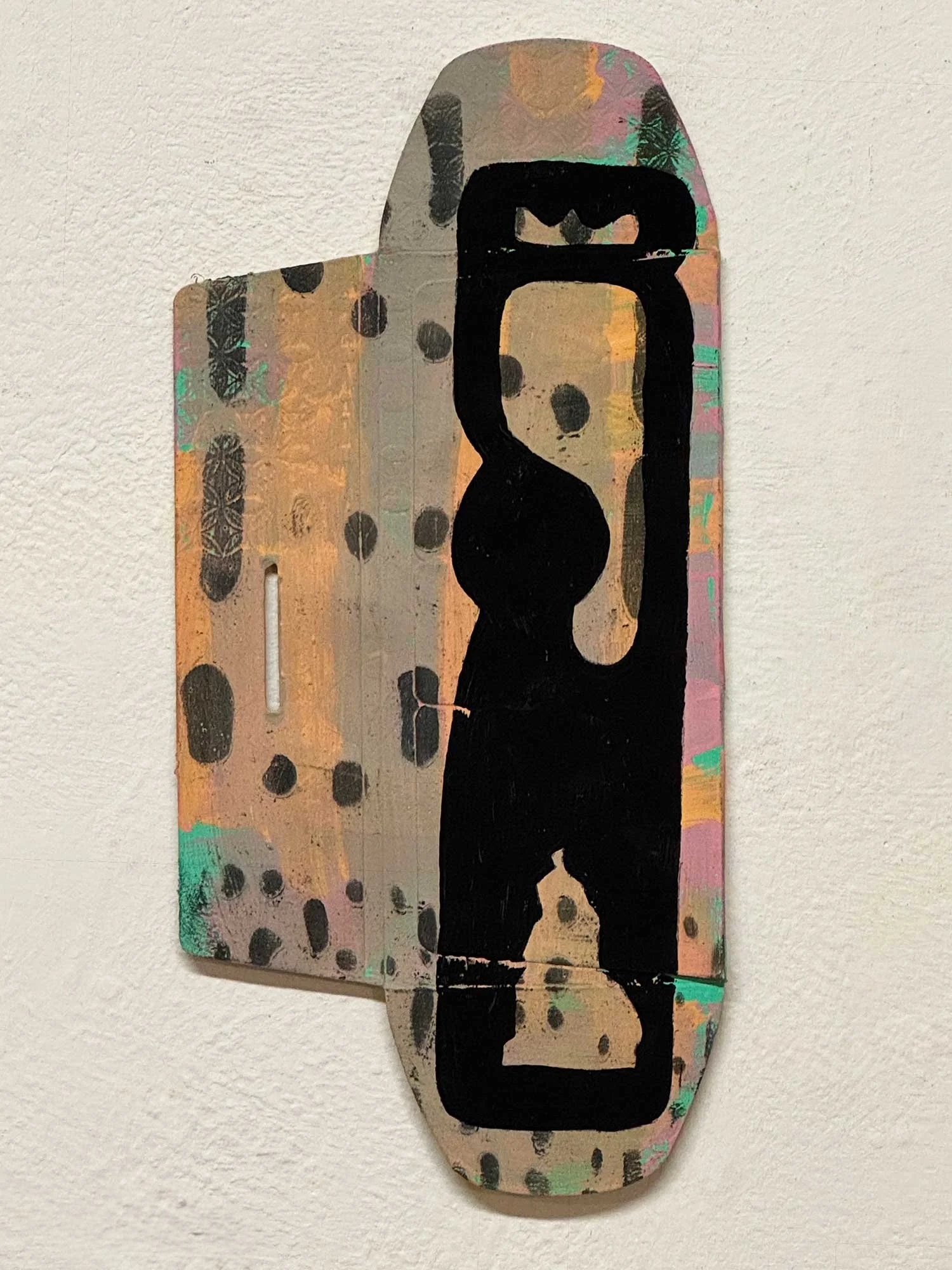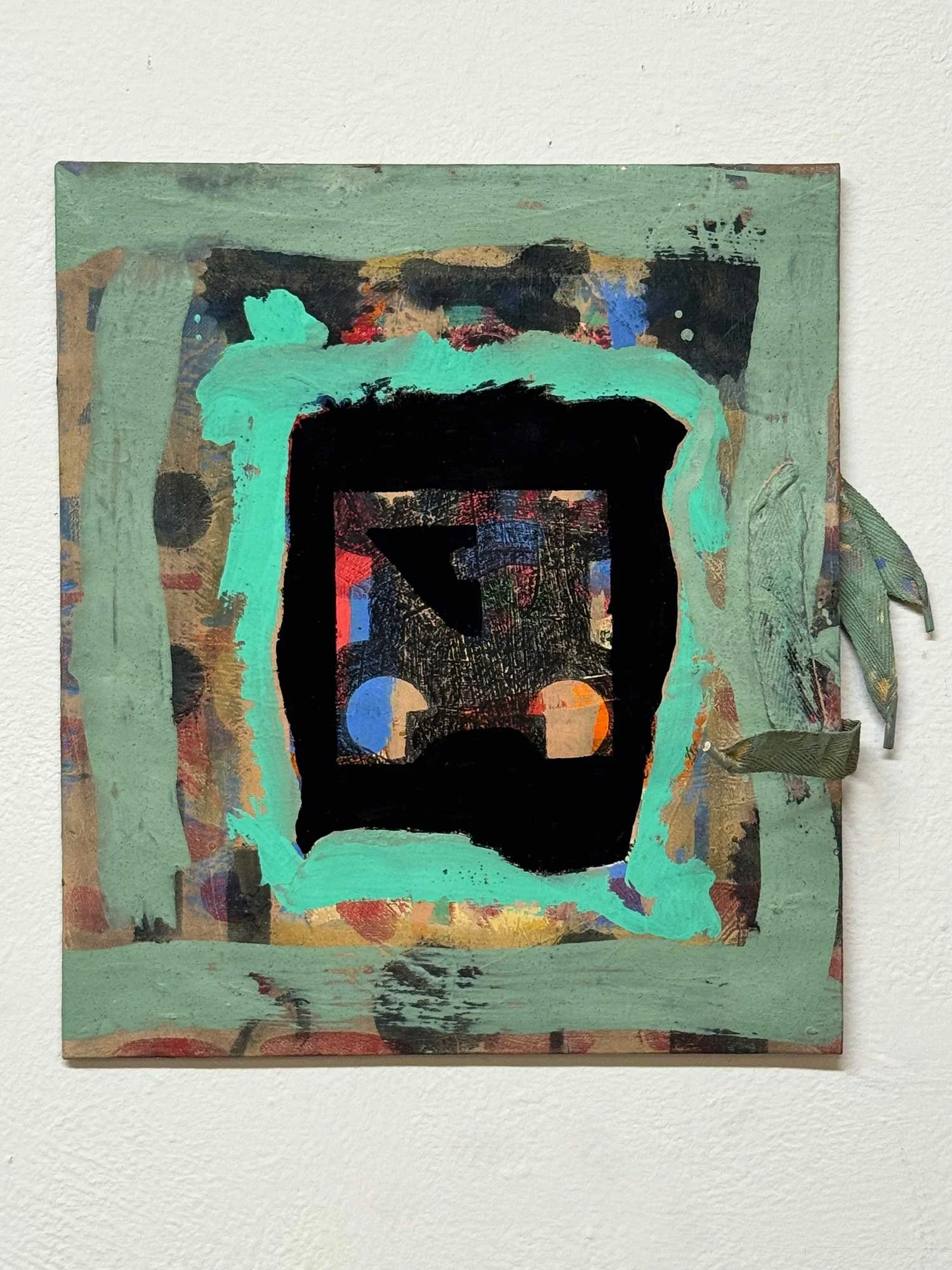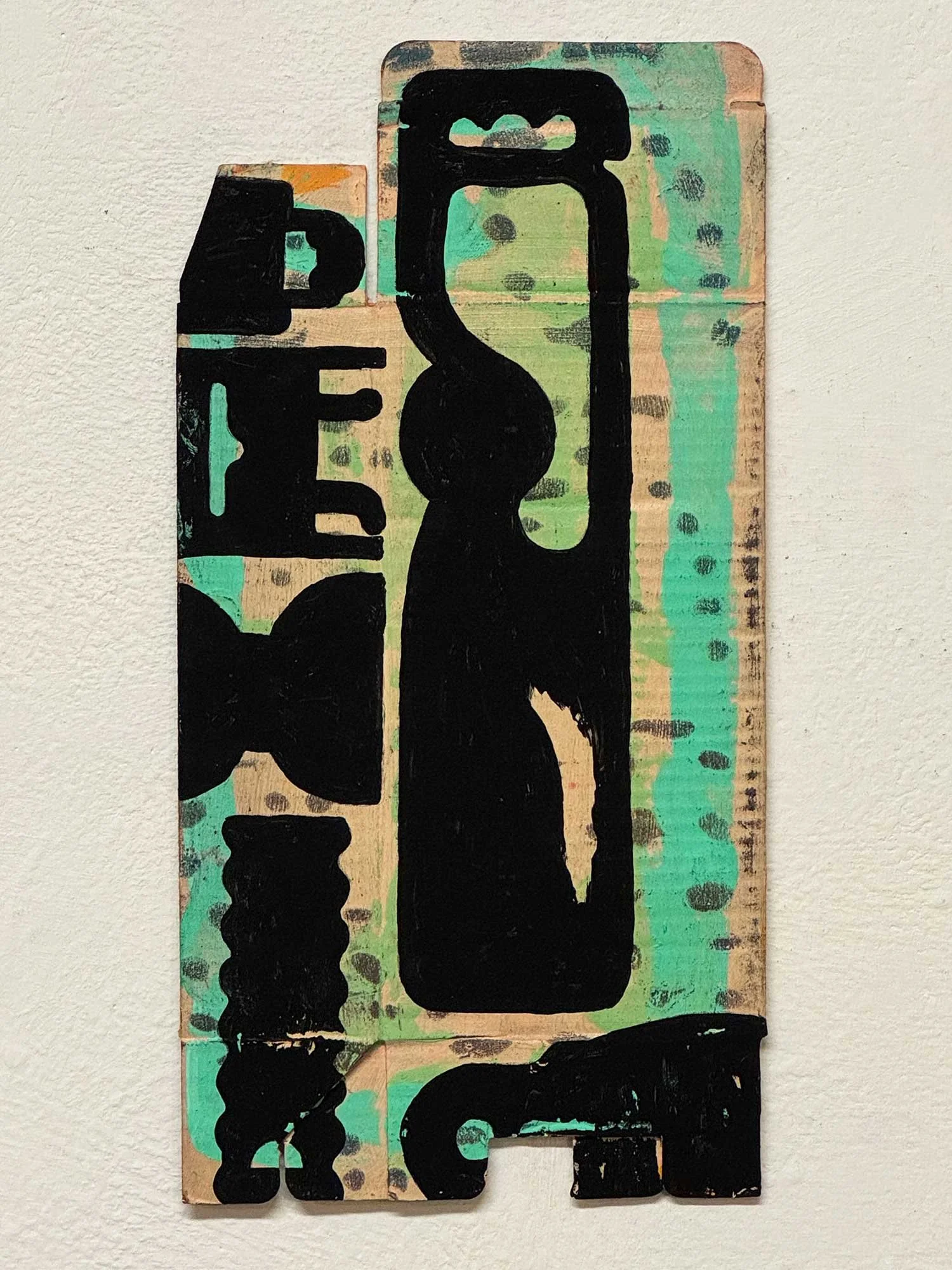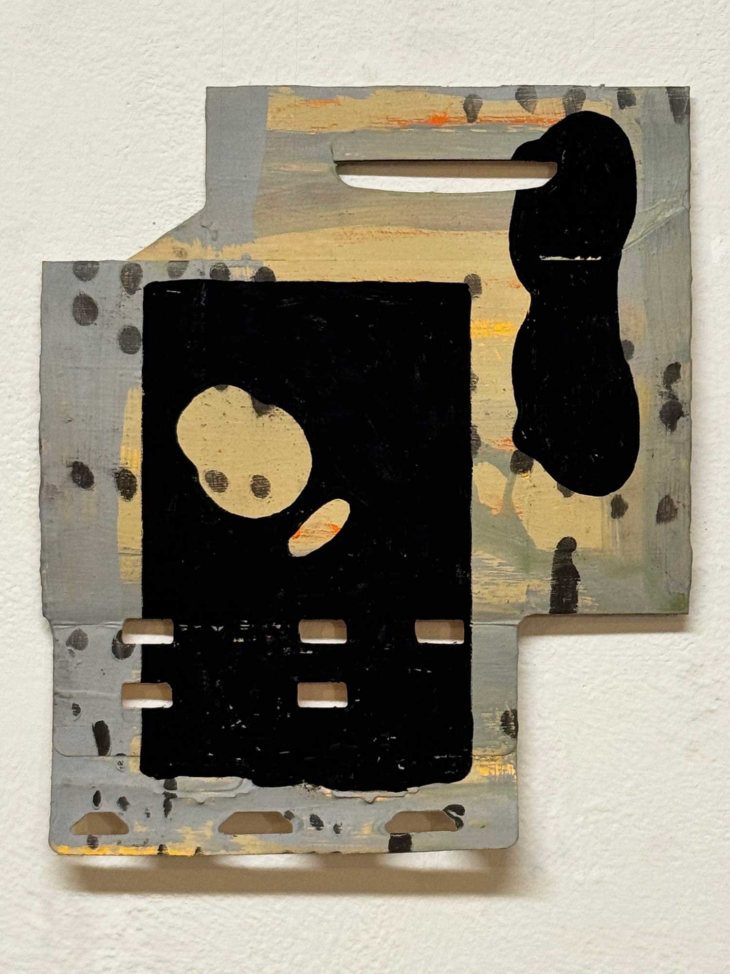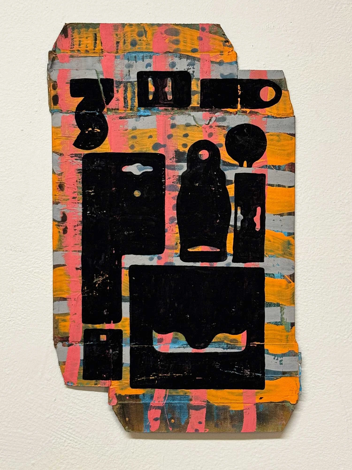 Black Deep: An ongoing series of small work on flattened commercial packaging. Paint (with a bit of red glitter), pastel, occasional ink, and black forms in intense black paint from Jackson’s. The black shapes are outlined with my collection of hundreds of various sized tags, labels, etc. from commercial goods. Sizes from approximately 6” x 4” to 19” x 12”. All 2026.